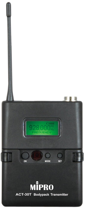 ACT 30 T to miniaturowy bodypack z wysokim poziomem wejściowym SPL oraz układem modulacji o dużym zakresie dynamiki ''Photo-cell Coupling''. Nadajnik posiada przełącznik wyboru impedancji wejściowej umożliwiający dopasowanie do źródła sygnału (mic, guitar, line input). Bodypack posiada również przycisk wyciszajacy mute. Opcjonalnie będzie dostępny równiez pilot zdalnego wyciszenia. Body pack posiada podświetlany wyświetlacz, programowalną moc nadajnika, regulowany gain, cichy wyłącznik i 6-segmentowy wskaźnik stanu naładowania baterii. Nadajnik posiada złącze mini-XLR do podłaczania mikrofonów nagłownych i krawatowych lub gitary za pomocą opcjonalnego kabla MU-40 G.
