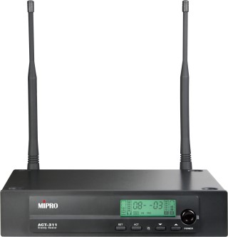 Mipro Seria ACT-3 to systemy Diversity w skład których wchodzą odbiorniki UHF w różnych konfiguracjach. Odbiorniki pracują w zakresie częstotliwości nośnych UHF 620~934MHz i oferują aż 961 częstotliwości. W danym zakresie pasma mamy do wyboru 8 presetów. Odbiorniki wyposażone są w system AutoScan ułatwiający wyszukiwanie wolnej częstotliwości w eterze, oraz funkcję ACT (Automatic Channel Targetting) ułatwiające synchronizację nadajnika z odbiornikiem za pomoca jednego przycisku. Nowa seria odbiorników wyposażona jest w ekran LCD na którym wyswietlane są wszystkie parametry takie jak grupa, kanał, częstotliwość, poziom naładowania baterii nadajnika, RF, audio, mierniki poziomu SQ, wskaźnik aktywnej anteny oraz ostrzeżenie przed zakłóceniami. System został wyposażony w układy "PiloTone & NoiseLock" dla zminimalizowania zakłóceń. Wszyskie funkcje są intuicyjne i łatwo ustawiane za pomoca przycisków dostępnych na przednim panelu odbiornika. odbiorniki wyposażono w wyjście symetryczne XLR, niesymetryczne TS oraz przełącznik poziomu wyjściowego Mic/Line. Do odbiorników serii ACT-3 dedykowane są nowe nadajniki. Do wyboru mamy mikrofon bezprzewodowy ACT 30 H i nadajnik typu bodypack ACT 30 T. Pozostałe parametry systemu: pasmo przenoszenia 50Hz~18KHz, odstęp od szumu >106dB(A), zniekształcenia <0.5%@1KHz, zasięg 100m