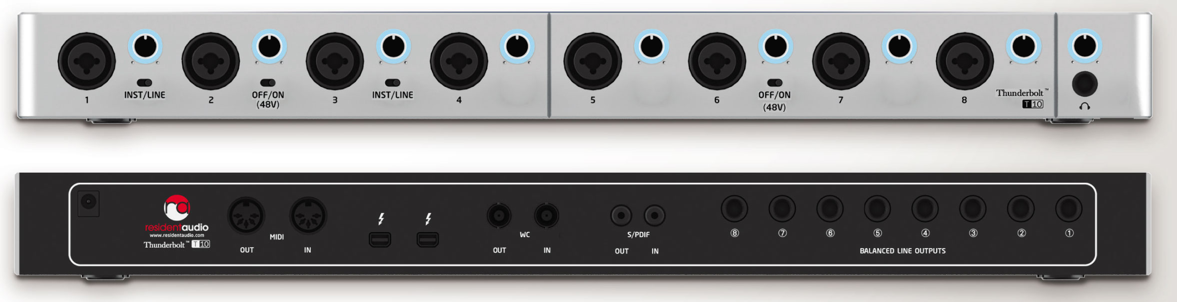 Montowany w racku interfejs audio T10 świetnie sprawdzi się jako centralne urządzenie w każdym profesjonalnym studio. Wyposażony w 8 wejść mic/line i 8 symetrycznych wyjść audio oraz złącza MIDI I/O, S/PDIF I/O i Word Clock. Dodatkowo posiada 2 porty Thunderbolt dzięki którym można łączyć w łańcuch do 6 interfejsów co daje w sumie 48 kanałów wejściowych działających z prędkością Thunderbolt. Interfejs posiada nowoczesny design w 19 calowej obudowie rackowej w rozmiarze 1U. Aby w pełni zasilać kilka interfejsów połączonych w łańcuch wejść i wyjść T10 posiada zewnętrzne zasilanie sieciowe.