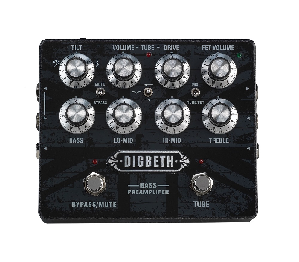 Przedwzmacniacz do gitary basowej - Digbeth DB-PRE. 2 kanały. Potencjometry /controls: TILT, BASS, LO-MID, HI-MID, TREBLE,Controls the post-gain level, TUBE DRIVE, MIX -TUBE/FET, FET VOLUME,TUBE FOOTSWITCH, MUTE/BYPASS FOOTSWITCH. Panel tylny: PSU input, gniazdo słuchawkowe, AUX IN, SOURCE SWITCH, XLR-Balanced D.I. Out, GROUND LIFT, Passive input, Active input, Link Output, FX LOOP SEND, FX LOOP RETURN, OUTPUT. Gniazdo zasilacza 9V DC PSU, 2.1x10mm connector type (opcjonalnie - brak w zestawie). Wymiary przedwzmacniacza: 60mm x 150mm x 125mm (HWD).