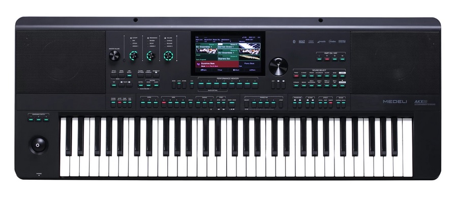 Medeli AKX10 to zaawansowany technologicznie keyboard z kolorowym wyświetlaczem dotykowym (7" TFT) z funkcją wyświetlania nut i wbudowanym rejestratorem/odtwarzaczem Audio. Instrument wyposażony został w takie technologie jak MARS (Medeli Advanced Realistic Synthesize), generator brzmieniowy powodujący że każda nuta AKX10 jest bezproblemowo zintegrowana z nieograniczoną liczbą warstw próbek i różnymi zmianami, zapewniając więcej szczegółów i większą autentyczność brzmień. W keyboardzie zastosowano także zaawansowany silnik stylów, który generuje wysokiej jakości style akompaniamentu. Po prostu zagraj kilka akordów na klawiaturze a Medeli AKX10 natychmiast zapewni pełne wrażenie zespołu. Teraz także nie musisz mieć odpowiedniej wiedzy z zakresu tworzenia własnych aranżacji ani odpowiedniego sprzętu. Keyboard ma wbudowany 16-ścieżkowy sekwencer, który pozwala na nagranie 1 ścieżki lub wszystkie 4 partie klawiatury, arpeggiatory i styl jednocześnie. Możesz zapisać swoje dzieło jako standardowy plik MIDI do dalszej edycji. Dzięki kreatorowi stylów możesz swobodnie edytować gotowe style lub tworzyć własne. Możesz nagrać każdą ścieżkę stylu, ustawić parametry odpowiadające za akord, zmienić wybór dźwięku oraz dostroić poziom głośności i panoramę ścieżek. Możesz nawet edytować parametry każdej nuty. Dodatkowo instrument posiada przypisywalne kontrolery: 2 pokrętła, 6 przycisków i 1 pedał. Możesz łatwo skonfigurować ich funkcje, wybierając spośród kilkudziesięciu opcji, w tym parametrów obwiedni, wartości efektu Reverb i Chorus. Możesz także wyznaczyć odpowiednie partie klawiatury i przesłać w formie komunikatu MIDI poprzez wyjście MIDI lub USB MIDI. Mocne nagłośnienie (2 x 25 W (woofer) + 2 x 15 W (tweeter)) dopełni możliwości Medeli AKX10.