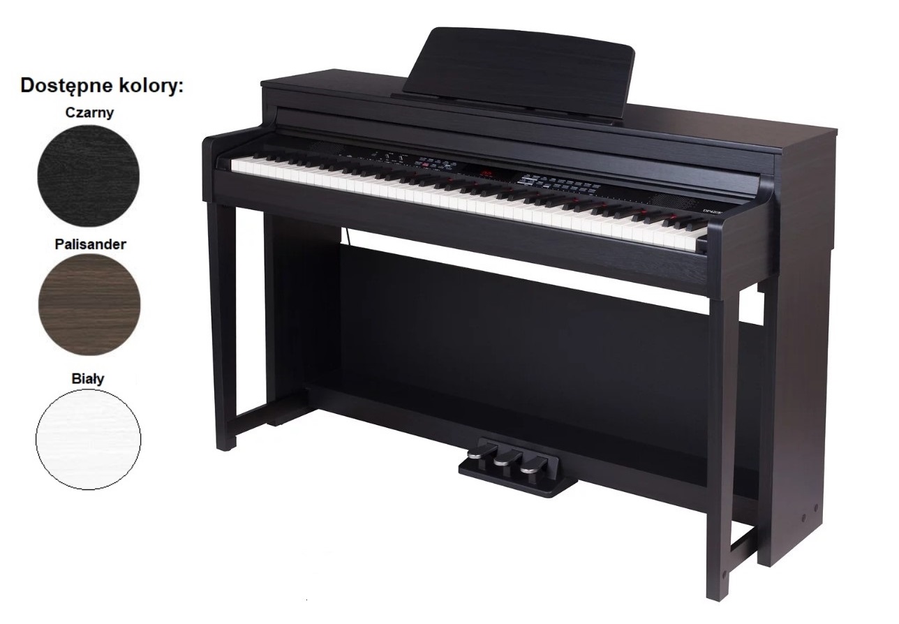 DP 420 K (RW). 88-klawiszy (klawiatura ważona młotkowa). Wyświetlacz: 3-cyfrowy LED. Polifonia: 128 głosów (max). Brzmienia: 40. Funkcja dual (łączone brzmienie): tak. Style: 50. Sequencer: 5 utworów użytkownika. Utwory demonstracyjne: 2 utwory piano; 40 demonstracji brzmień. Wymiary (mm): 1400 x 492 x 910. Waga (kg): 59. Kolor: Palisander. Instrukcja obsługi w języku polskim w komplecie.