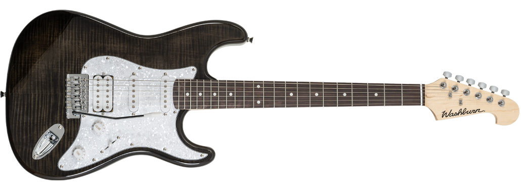 Podstrunnica: Techwood (Inlays dots). Typ gitary: Style Double Cut Solid Body. Potencjometry/controls: 1 Volume/1 Tone. 5-pozycyjny przełącznik przetworników (5 way switch). Pickupy w układzie: H-S-S - 1 Washburn Humbucker and 2 Sonamaster+ Single Coil. Skala instrumentu: 25-1/2. Hardware: chromowany. Mostek: ruchomy - Bridge Vintage Tremolo. Maszynki chromowane: Tuners Chrome Diecast. Wykończenie: wysoki połysk. Kolor: transparentny czarny.