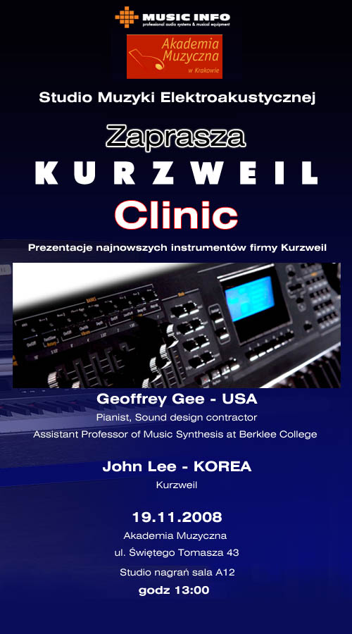 Music Info i Akademia Muzyczna ma przyjemność zaprosić na "Kurzweil Clinic. W prezentacji wezmą udział: